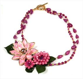 This necklace features hand-crafted floral cluster made with white beans, pumpkin seeds and crystals and is strung on multi-strands of crystal, glass and candy jade with 18K gold plated embellishments. I have admired various necklaces I have seen with floral focal points, but never have I seen another made with seeds and beans!