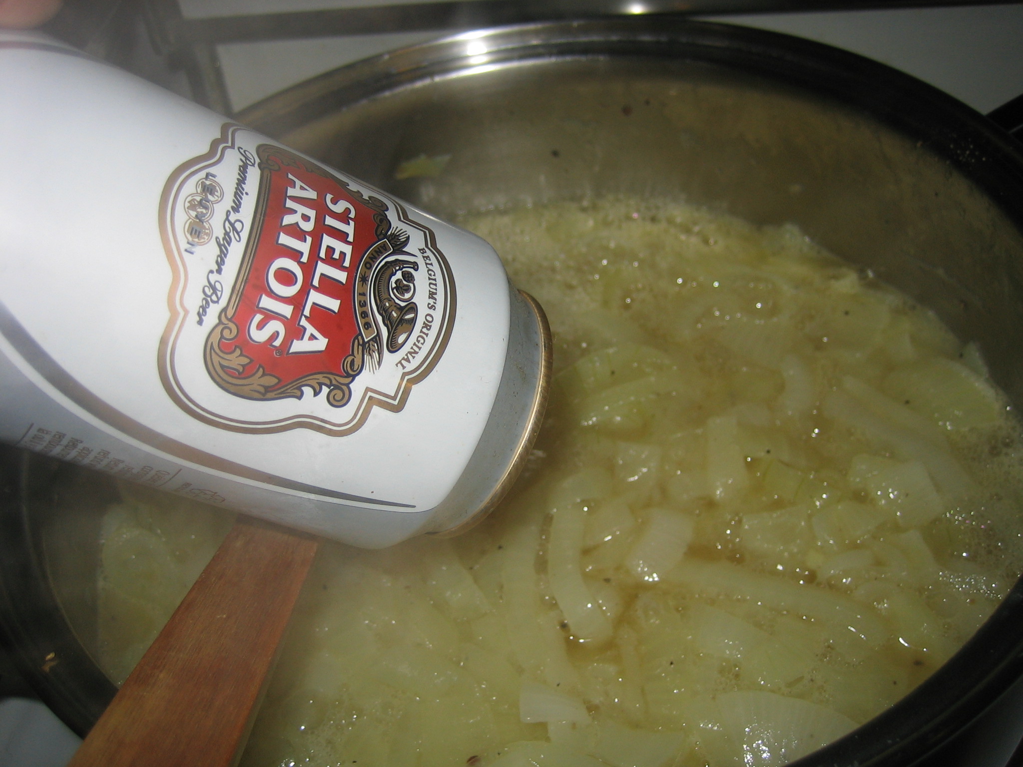 Add the butter, stirring to incorporate as it melts. Increase the heat to medium-high and then add the beer.