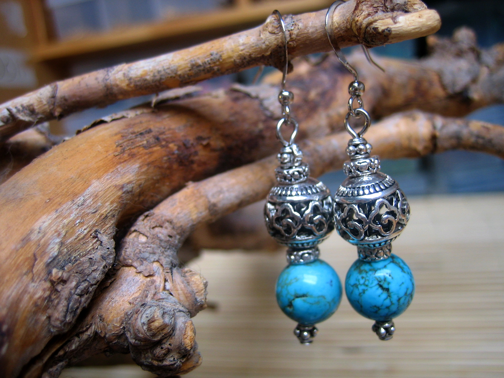 handmade turquoise clay beads with white gold plated earwires