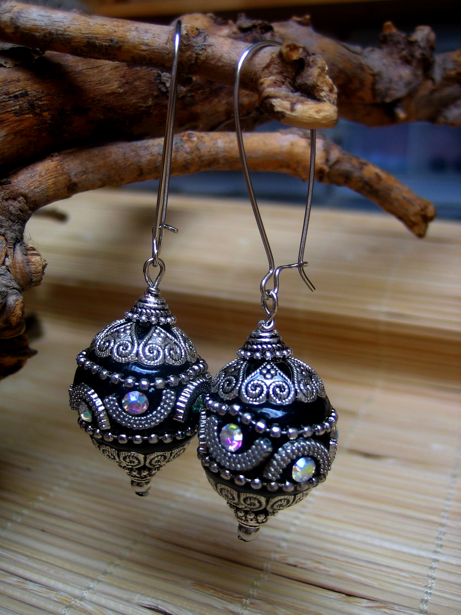black clay beads with crystal, antiqued silver and white gold earwires