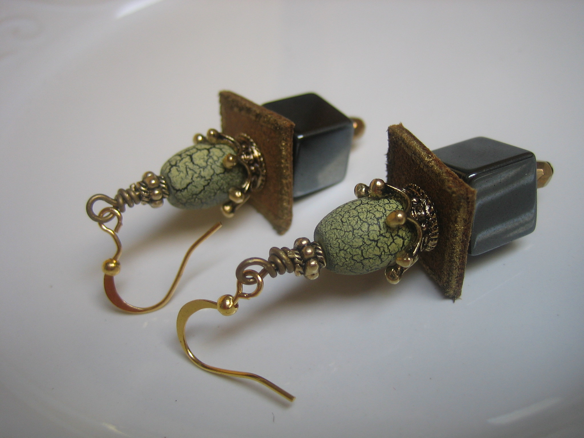 hematite, glass, brass and leather earrings with 18K gold plated earwires