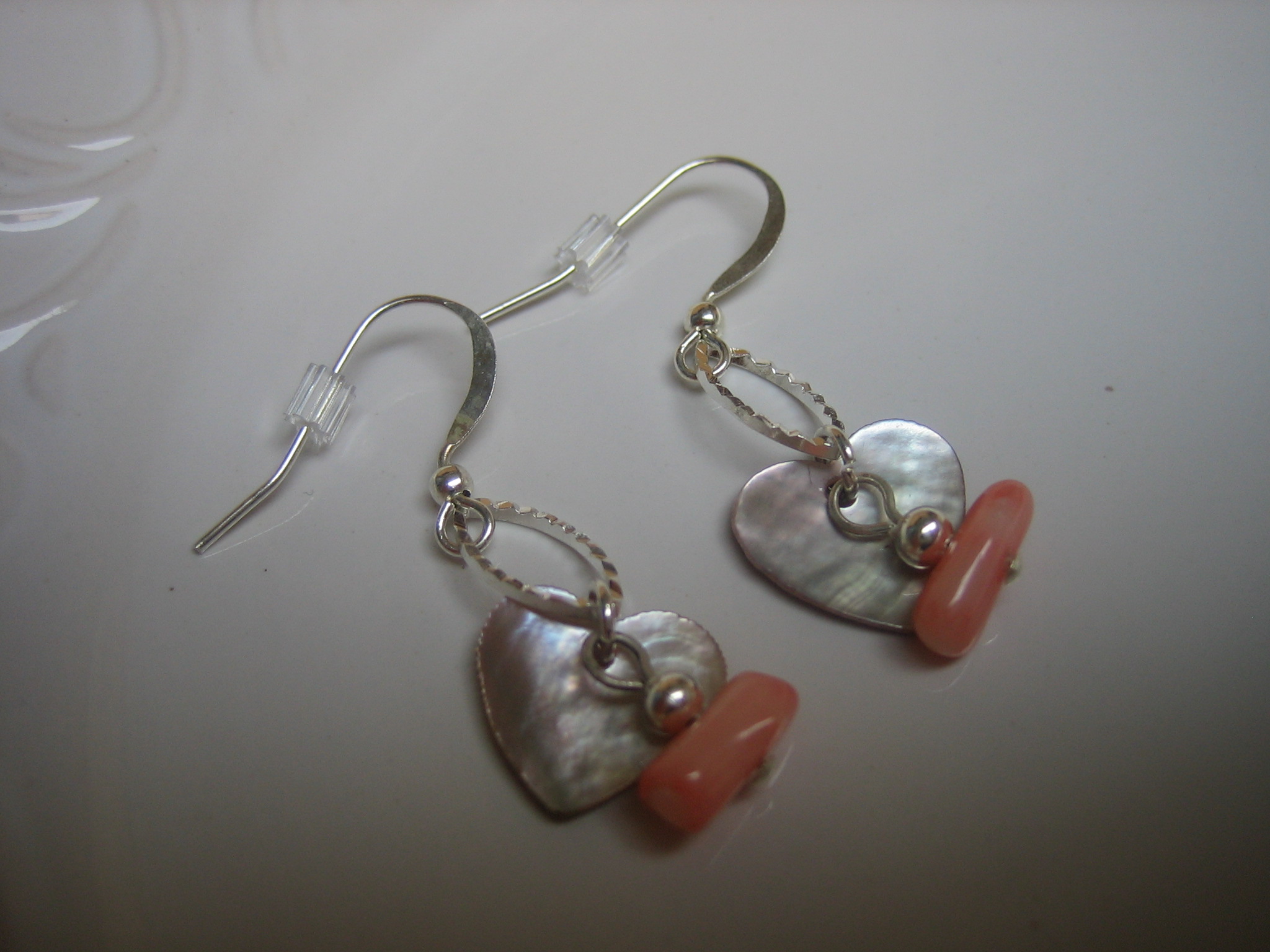 pink coral, shell, and sterling silver plate earrings