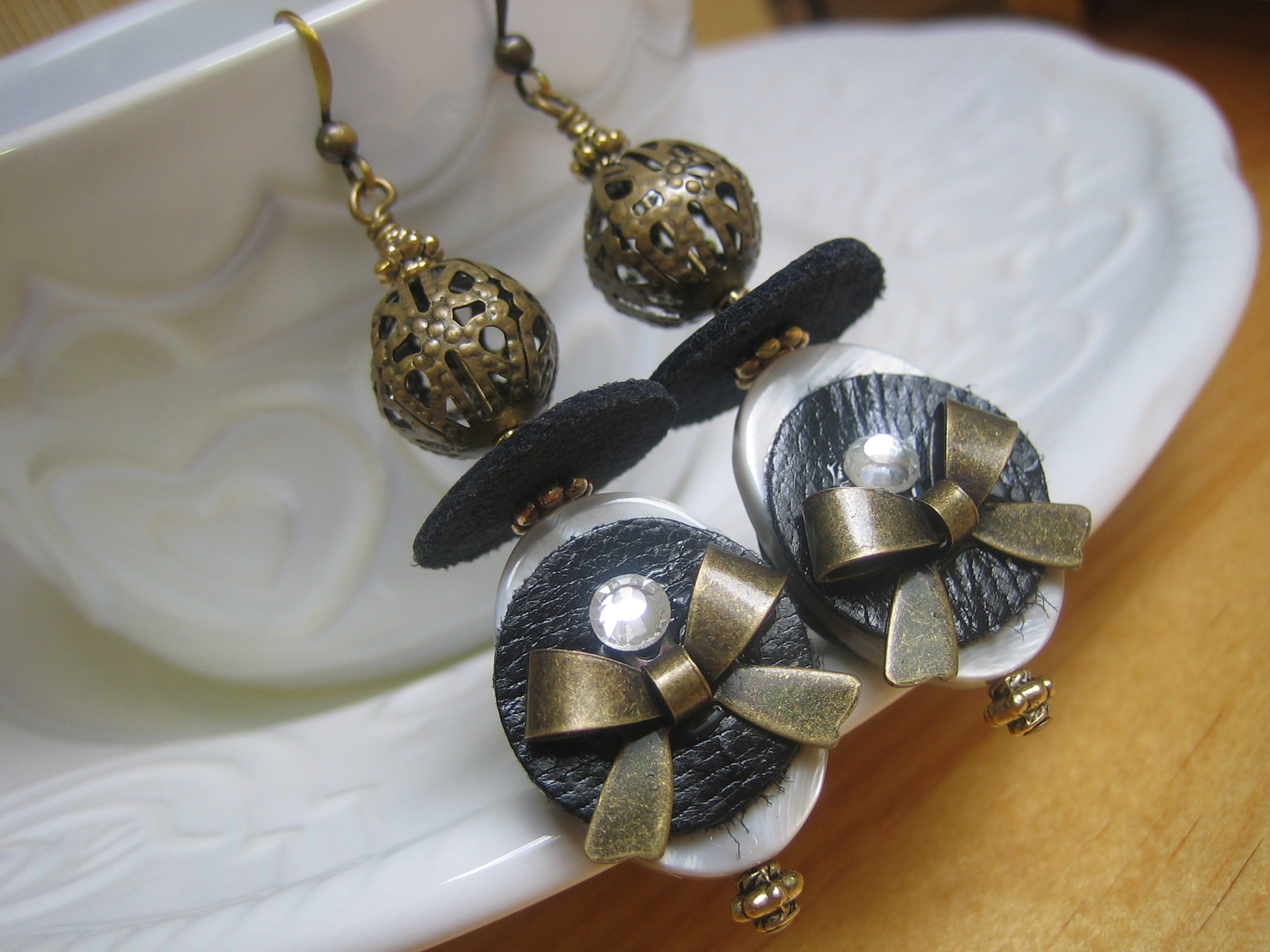 mother-of-pearl, brass, leather and crystal earrings with antiqued brass earwires