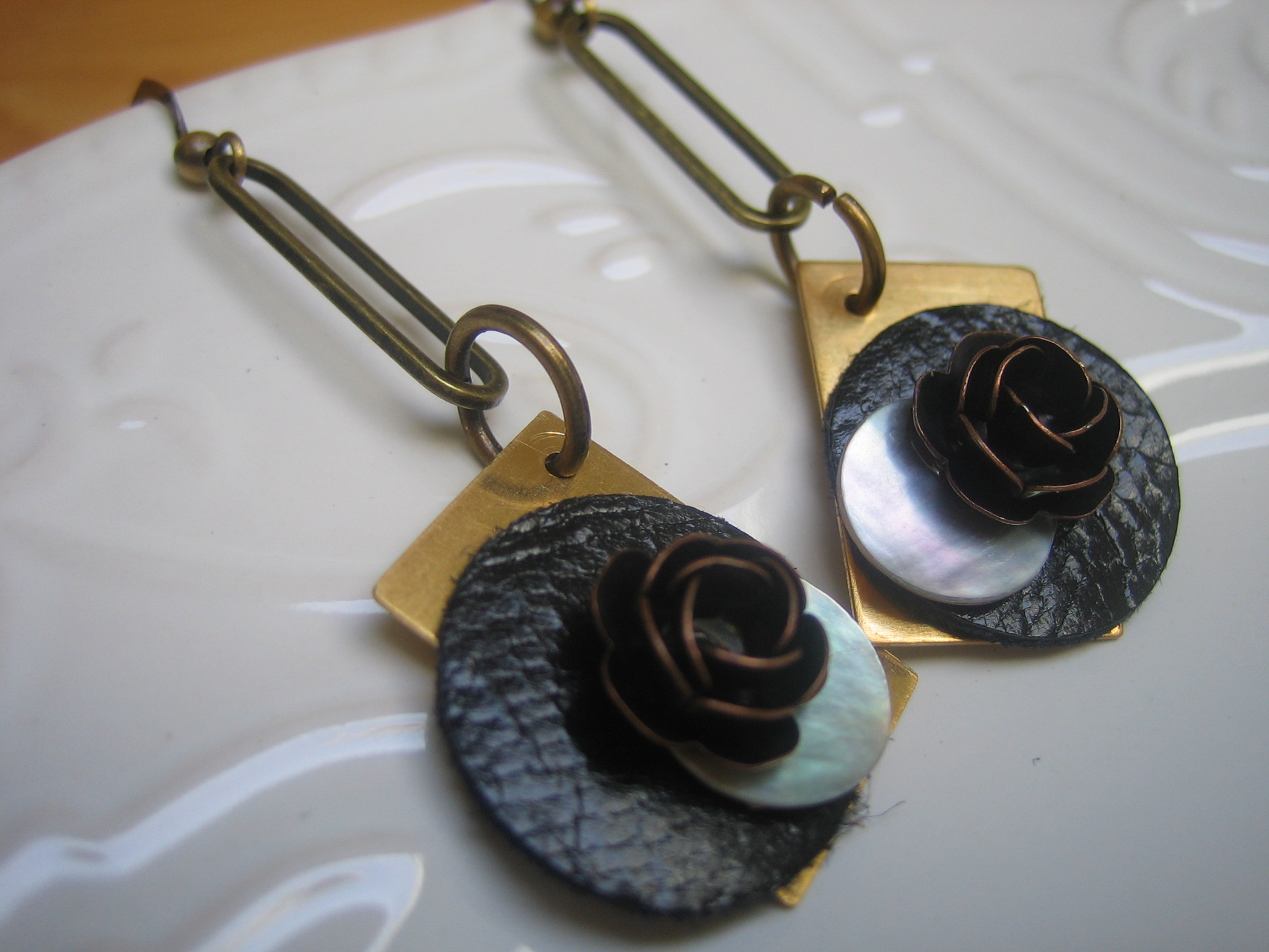brass, copper, shell and leather earrings with antiqued brass earwires