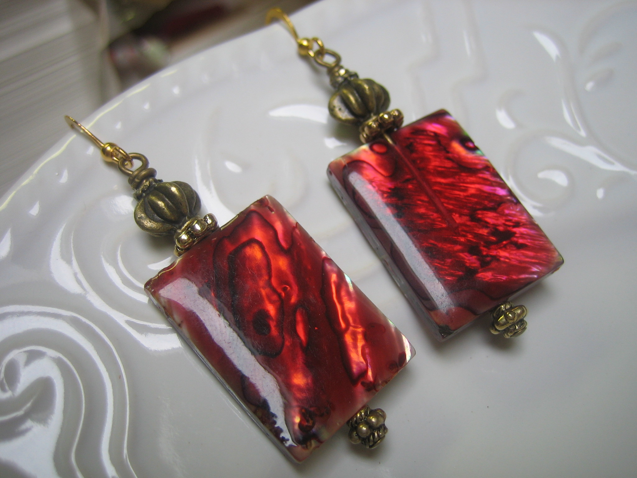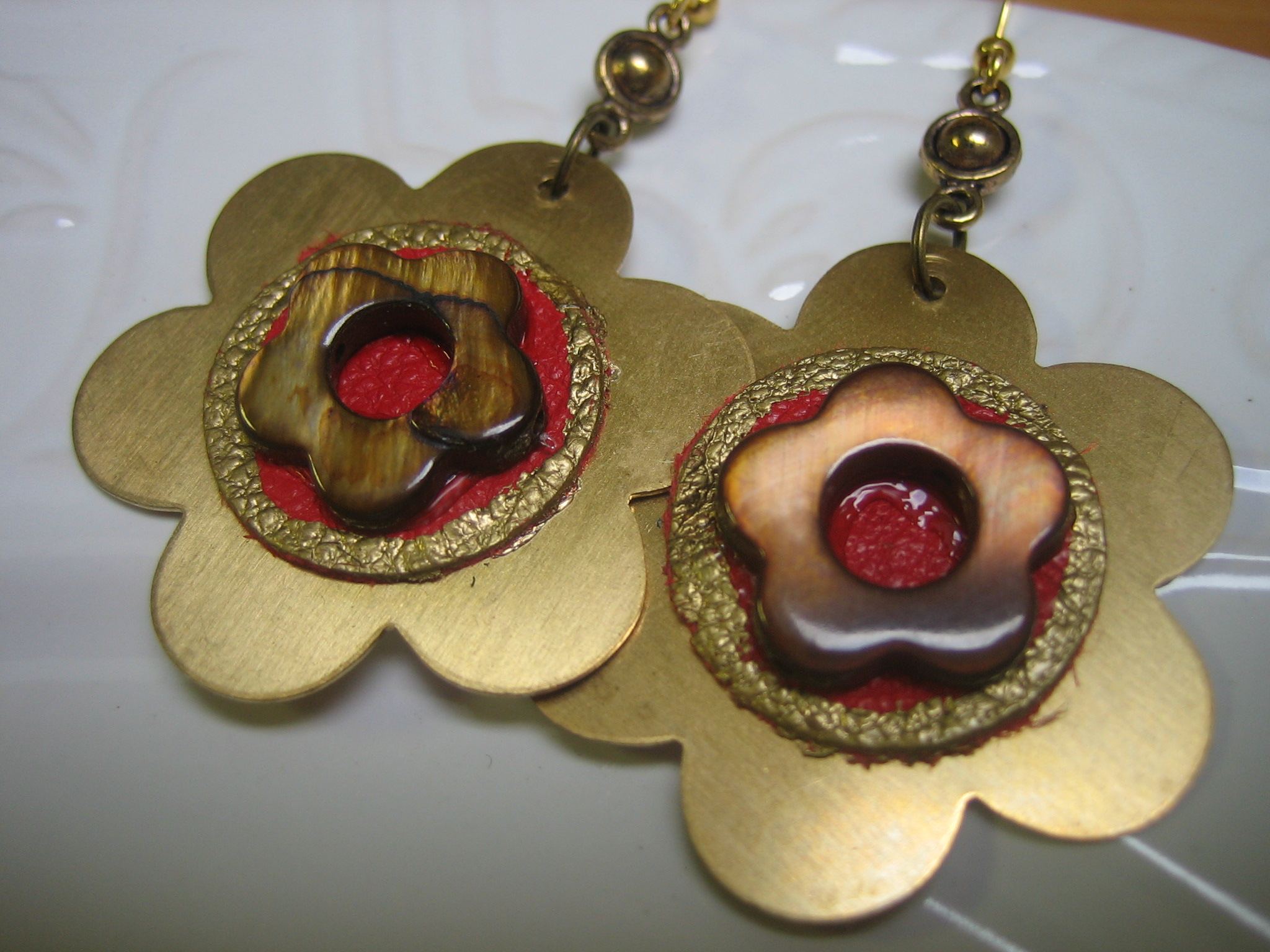 red abalone shell and brass earrings with 18K gold plated earwires