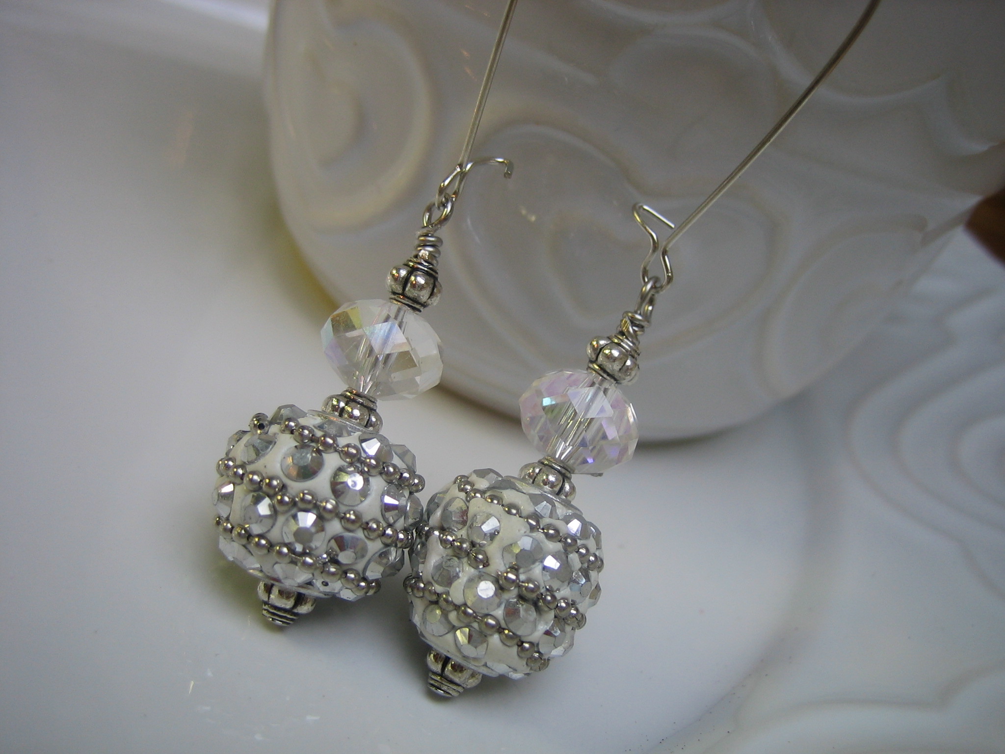 crystal and white clay bead earrings with white gold plated earwires