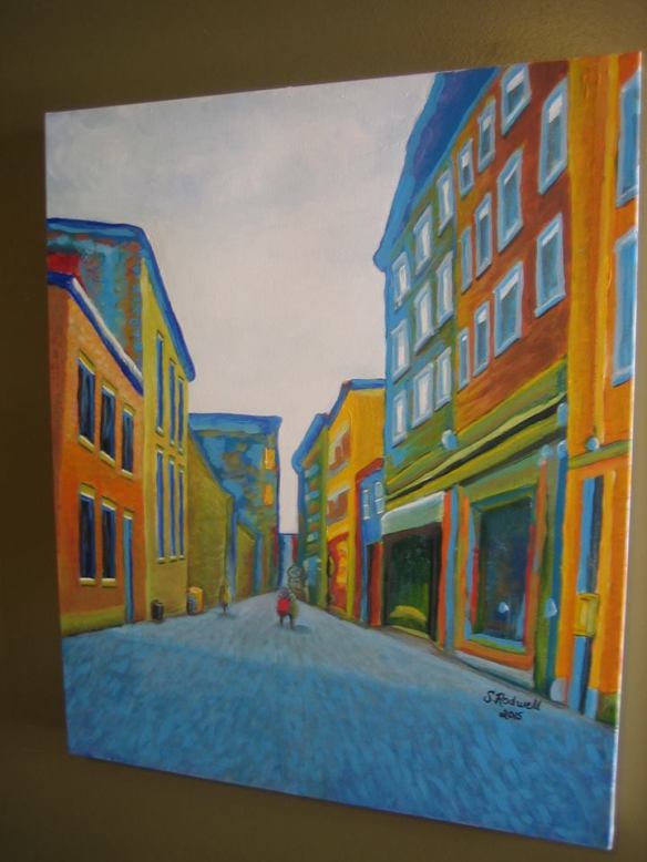 - “Petit Champlain” acrylic on canvas 20″ x 24″, by Sandra Rodwell, 2015 $675