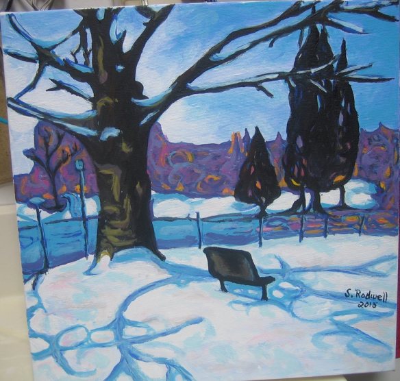 “Waiting For Spring In The Rose Garden” acrylic on canvas 12″ x 12″ by Sandra Rodwell, 2015