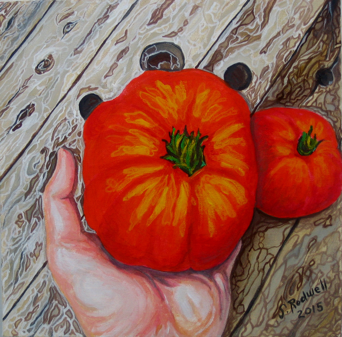“One Ton Tomato” acrylic on canvas, 12″ x 12″, by Sandra Rodwell, 2015 $225